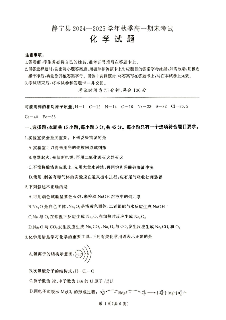 甘肃省平凉市静宁县2024-2025学年上学期1月高一期末考试化学