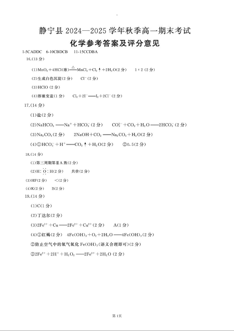 甘肃省平凉市静宁县2024-2025学年上学期1月高一期末考试化学答案