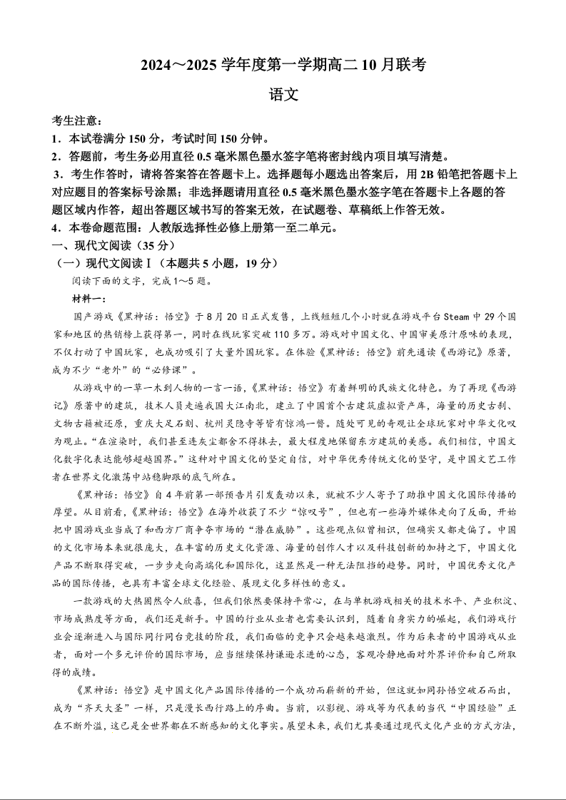 安徽省部分高中2024~2025学年度第一学期高二10月联考语文
