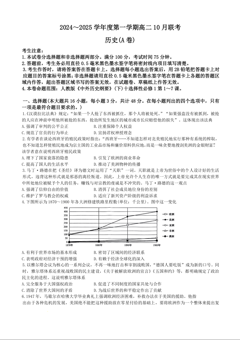 安徽省部分高中2024~2025学年度第一学期高二10月联考历史