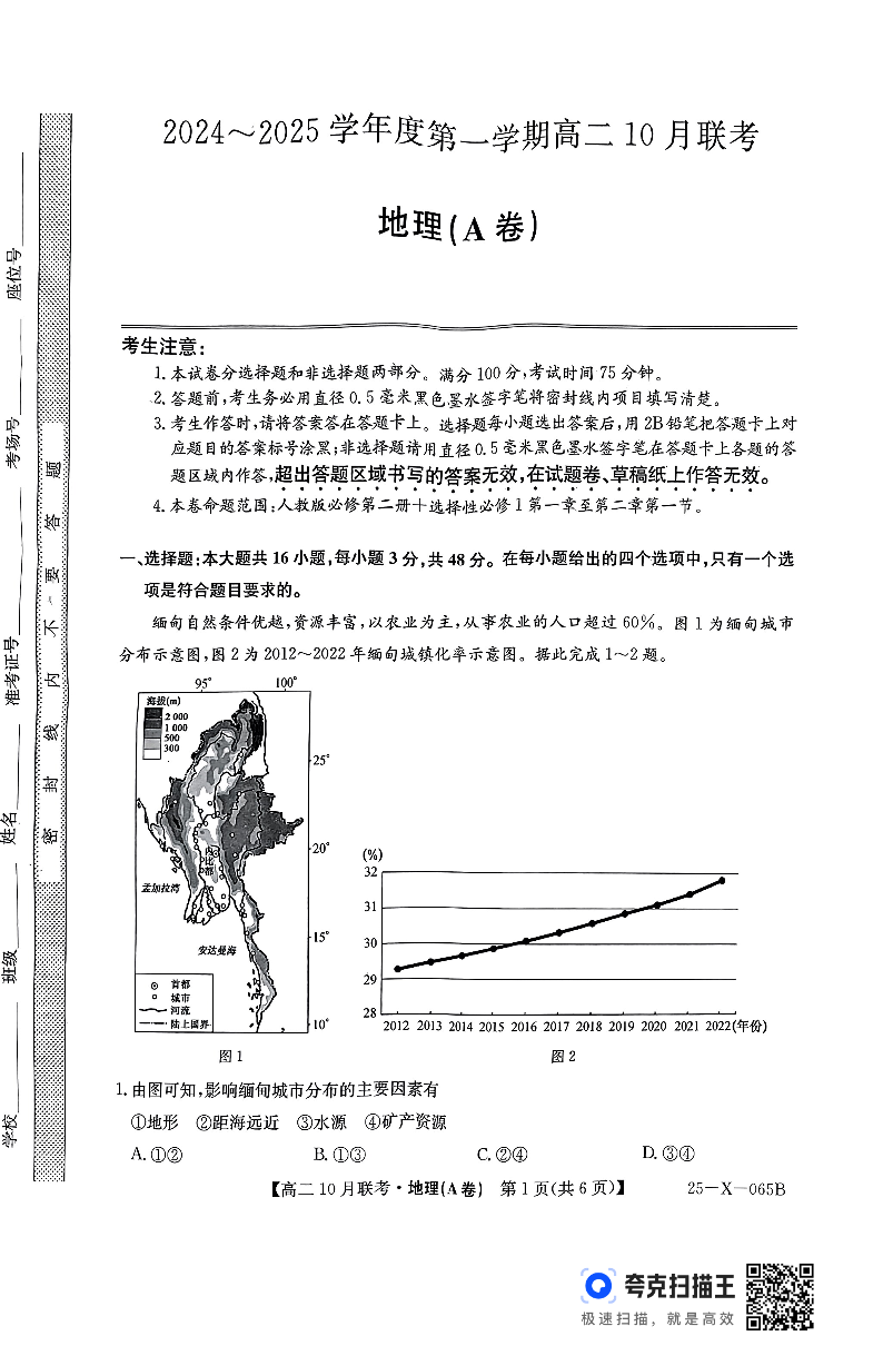 安徽省部分高中2024~2025学年度第一学期高二10月联考地理