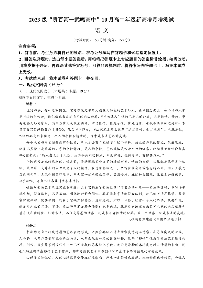 广西壮族自治区2023级“贵百河—武鸣高中”10月高二年级新高考月考测试语文+答案