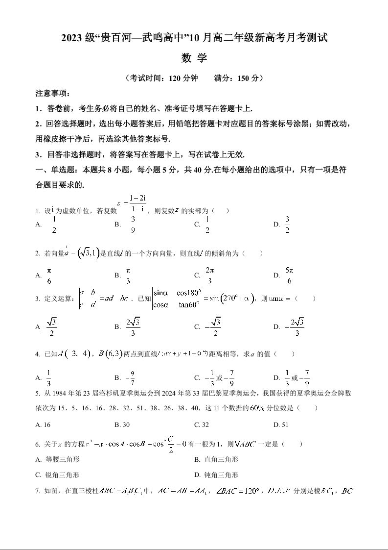 广西壮族自治区2023级“贵百河—武鸣高中”10月高二年级新高考月考测试数学+答案