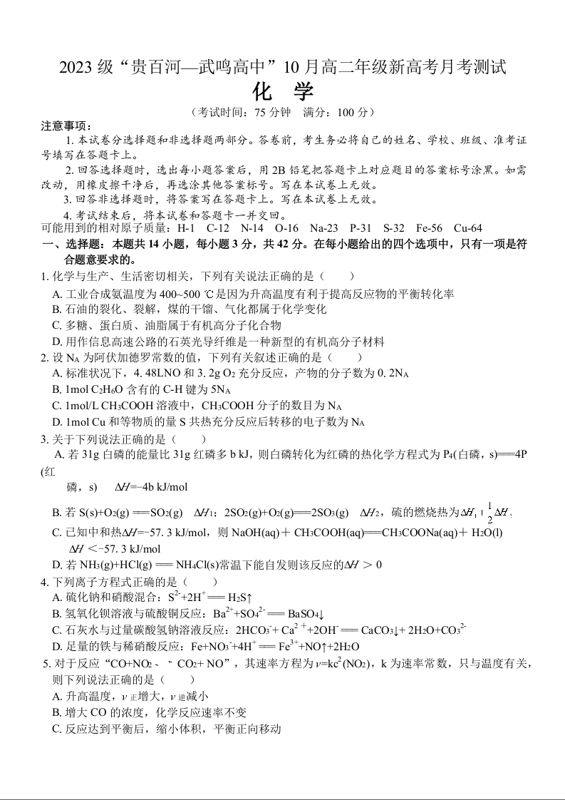 广西壮族自治区2023级“贵百河—武鸣高中”10月高二年级新高考月考测试化学+答案