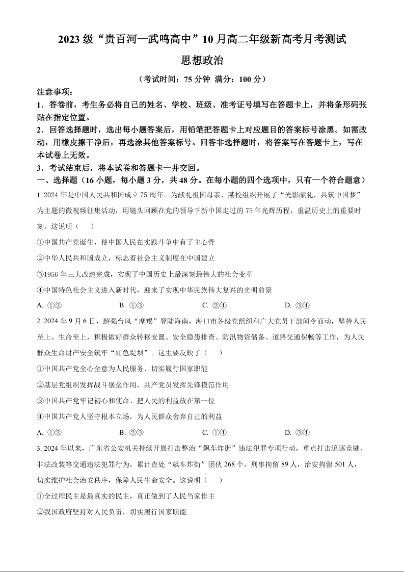 广西壮族自治区2023级“贵百河—武鸣高中”10月高二年级新高考月考测试政治+答案