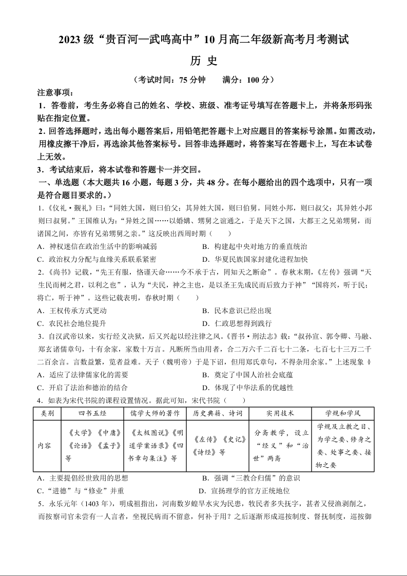 广西壮族自治区2023级“贵百河—武鸣高中”10月高二年级新高考月考测试历史+答案