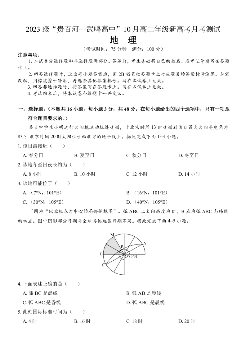 广西壮族自治区2023级“贵百河—武鸣高中”10月高二年级新高考月考测试地理+答案
