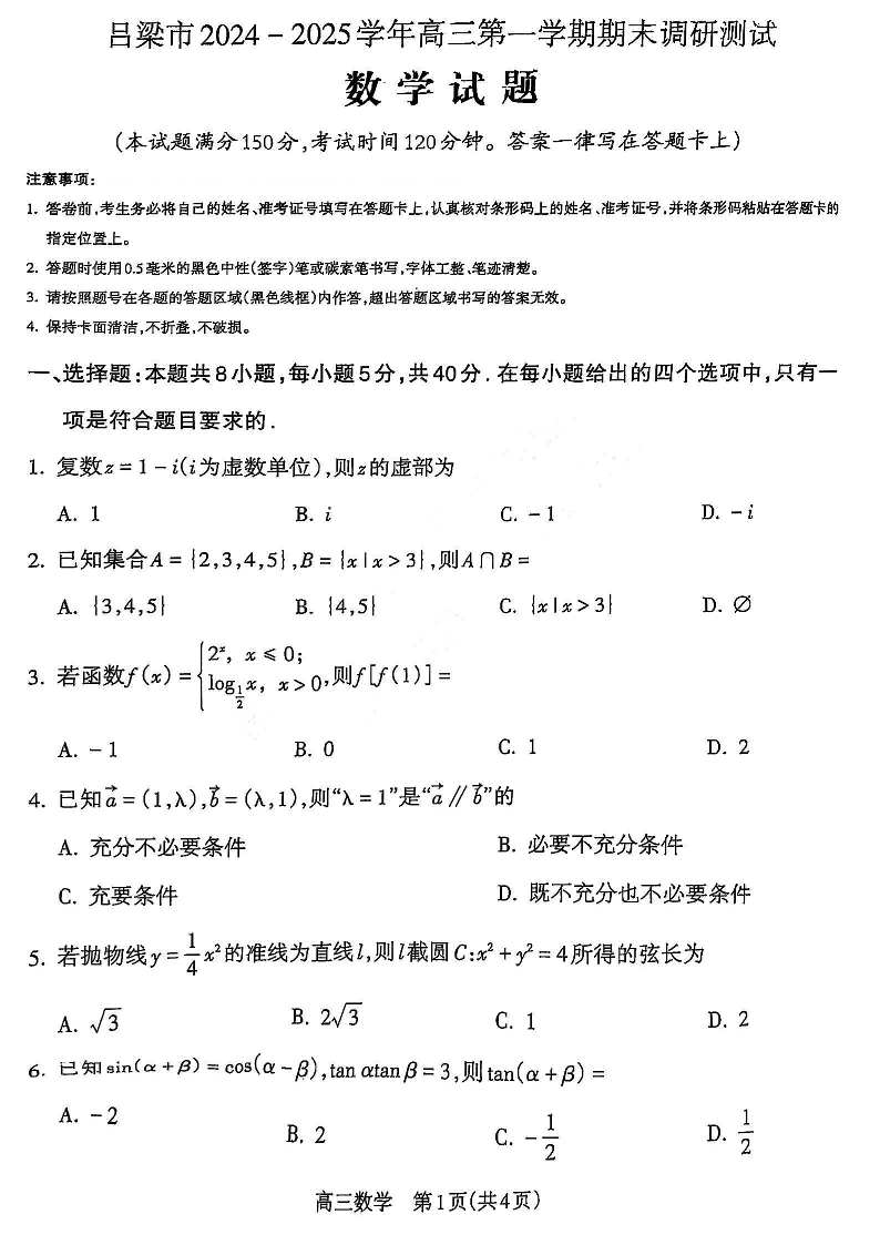 山西省吕梁市2025届高三上学期1月期末调研考试数学