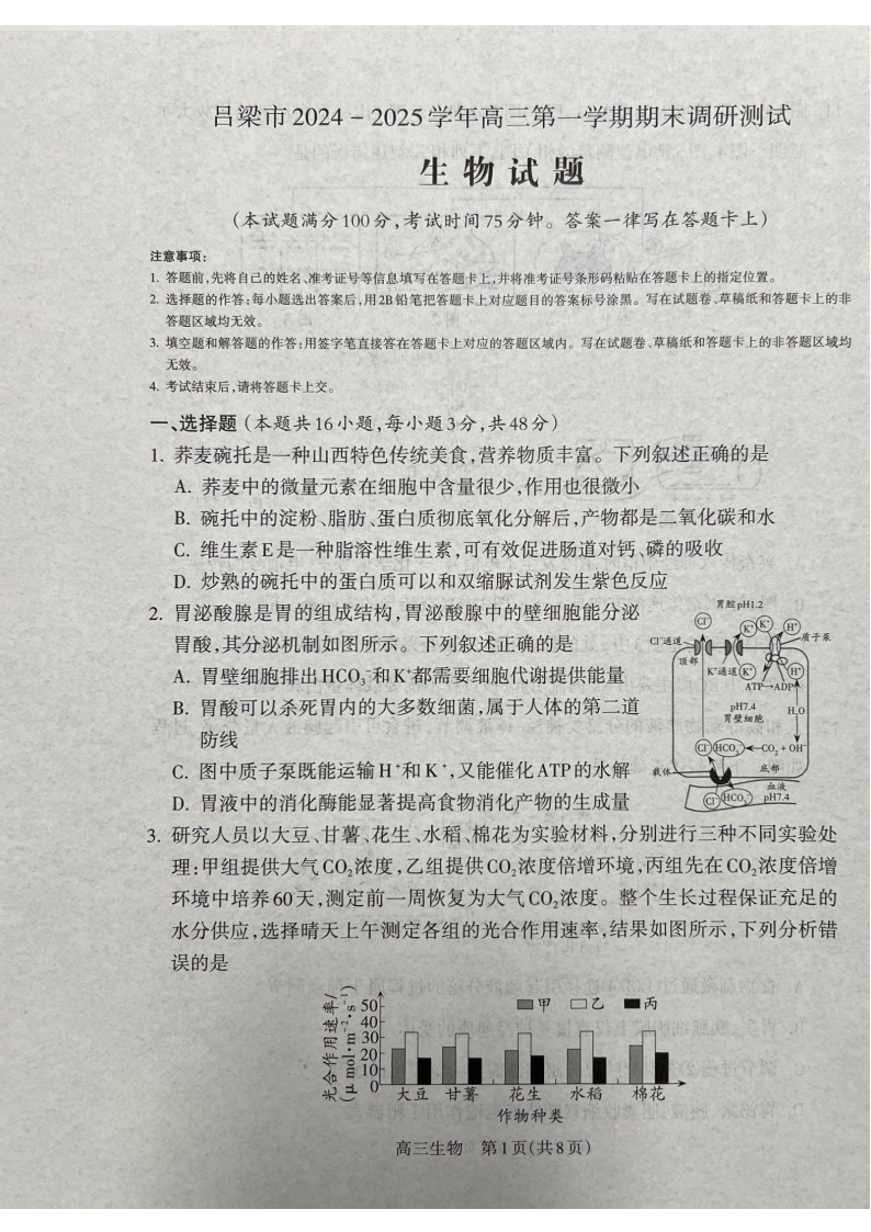 山西省吕梁市2025届高三上学期1月期末调研考试生物