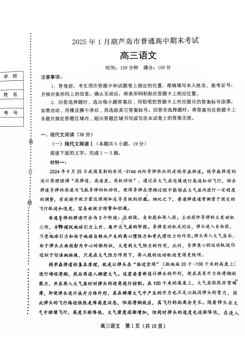 辽宁省葫芦岛市2025届高三上学期1月期末考试语文