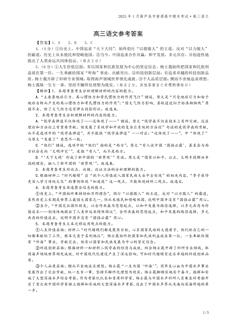 辽宁省葫芦岛市2025届高三上学期1月期末考试语文答案