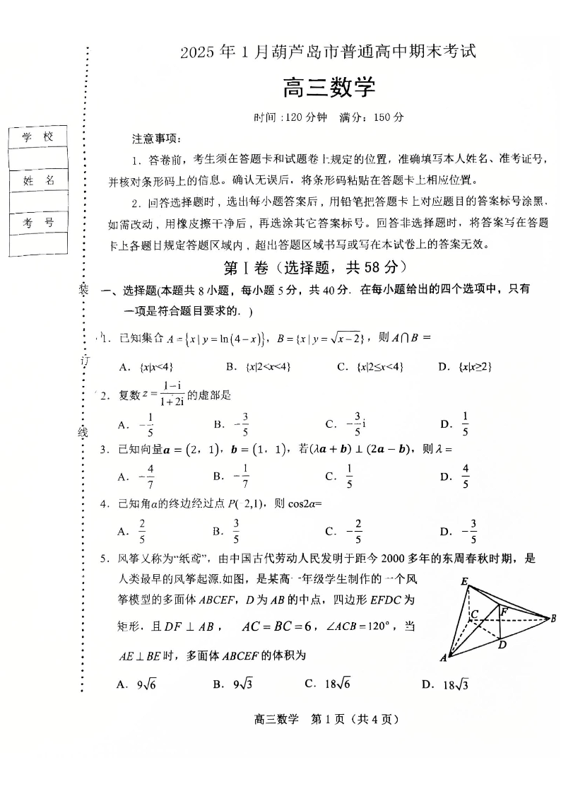 辽宁省葫芦岛市2025届高三上学期1月期末考试数学