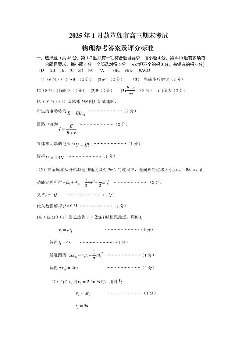 辽宁省葫芦岛市2025届高三上学期1月期末考试物理答案