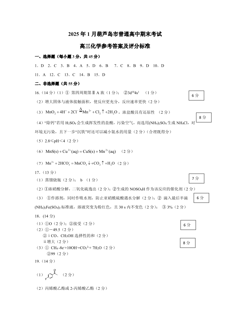 辽宁省葫芦岛市2025届高三上学期1月期末考试化学答案