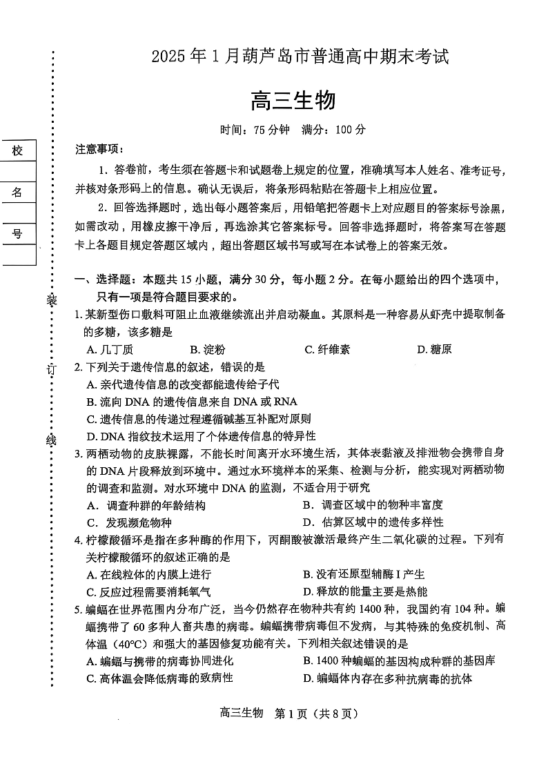 辽宁省葫芦岛市2025届高三上学期1月期末考试生物