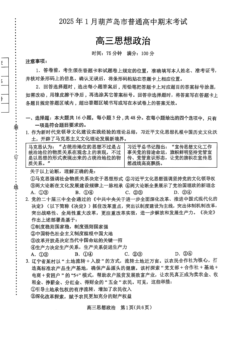 辽宁省葫芦岛市2025届高三上学期1月期末考试政治
