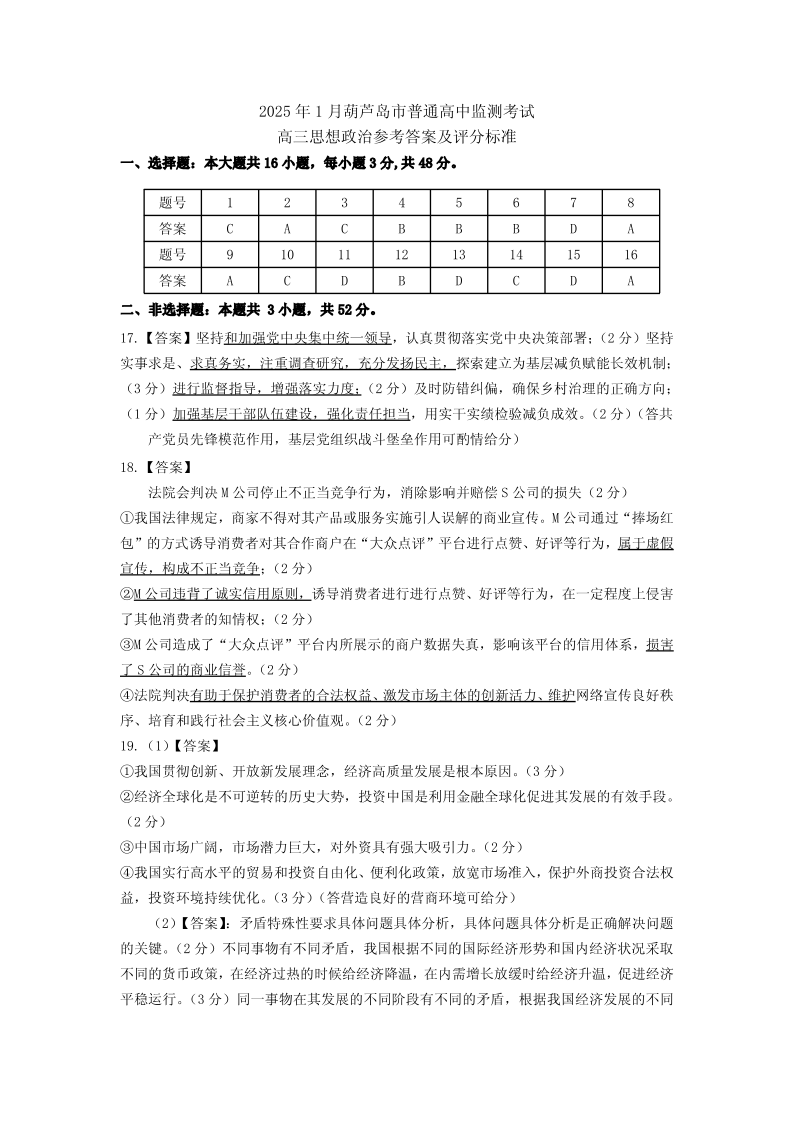 辽宁省葫芦岛市2025届高三上学期1月期末考试政治答案