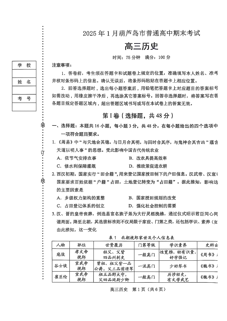 辽宁省葫芦岛市2025届高三上学期1月期末考试历史