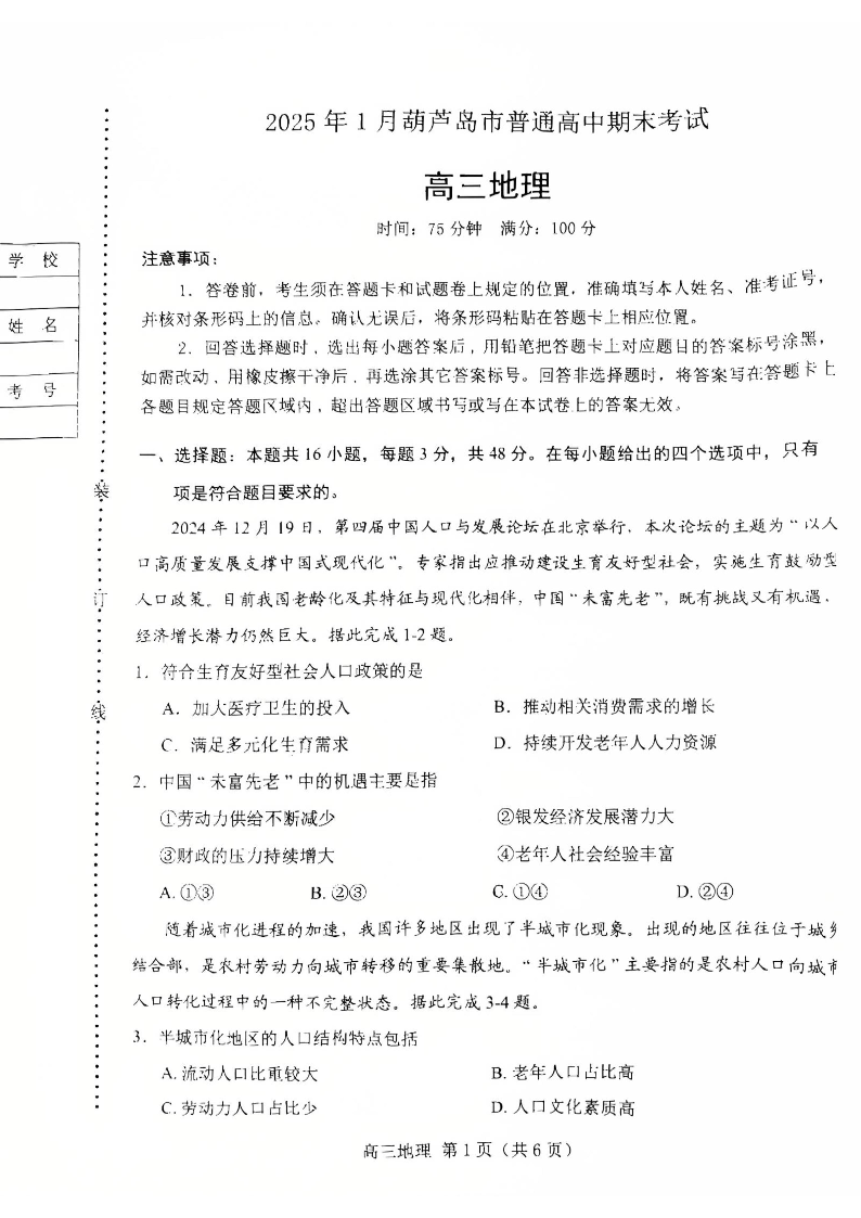 辽宁省葫芦岛市2025届高三上学期1月期末考试地理