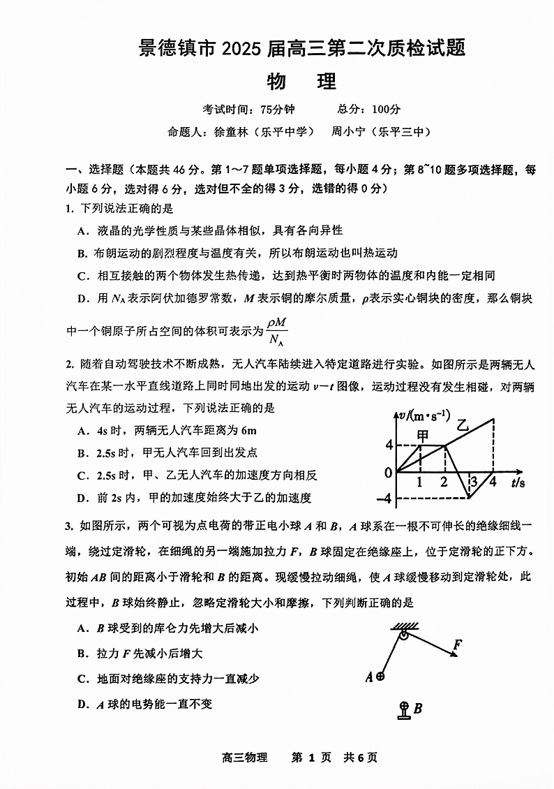 江西省景德镇市2025届高三上学期1月第二次质量检测(二模)物理+答案