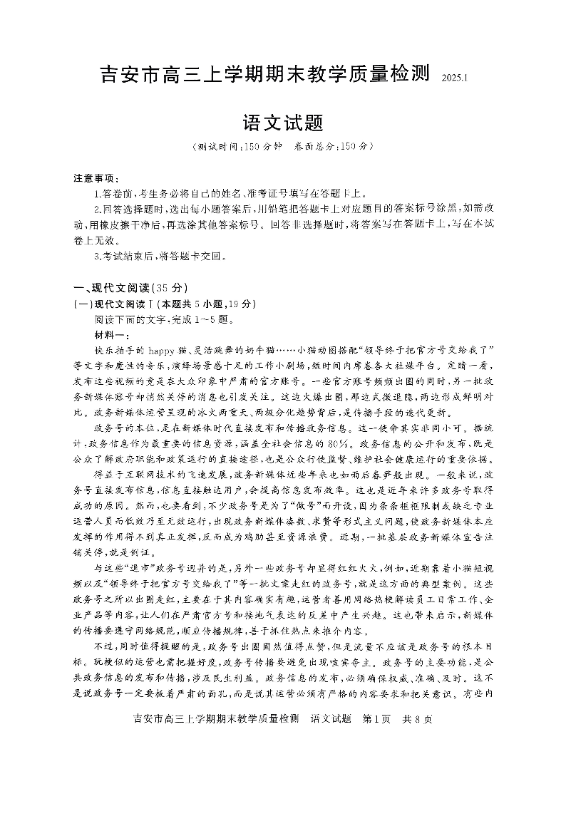 江西省吉安市2025届高三上学期1月期末教学质量检测语文+答案