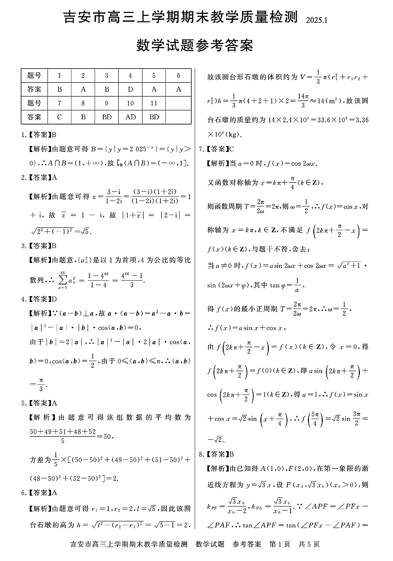江西省吉安市2025届高三上学期1月期末教学质量检测数学答案
