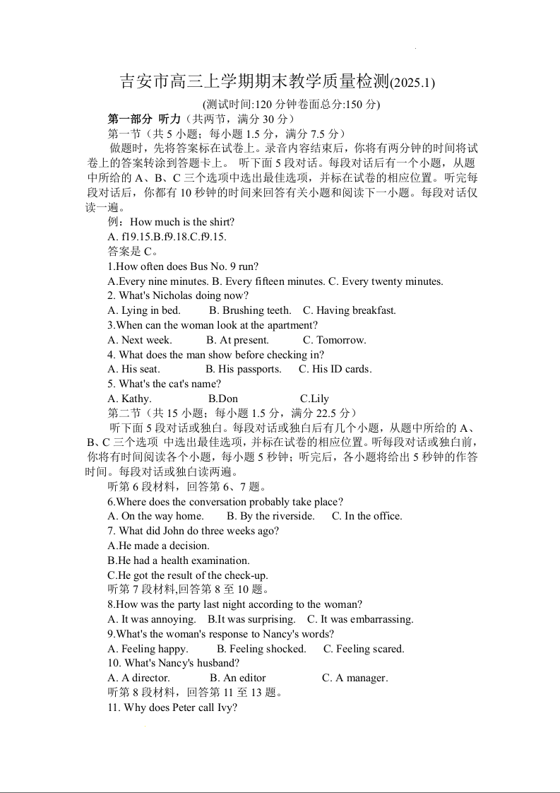 江西省吉安市2025届高三上学期1月期末教学质量检测英语