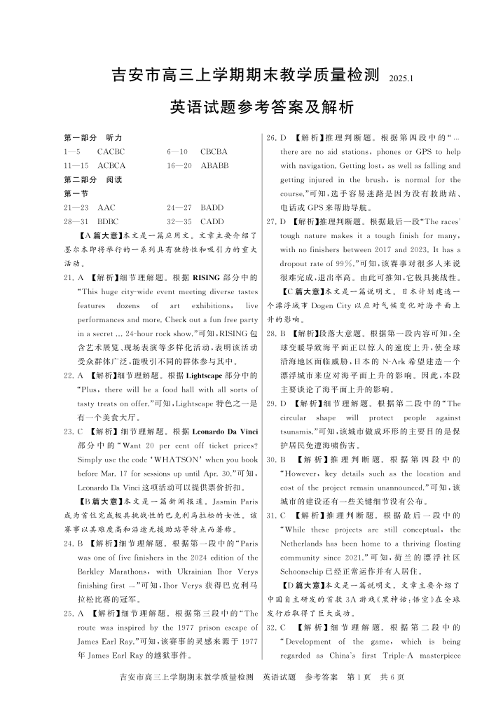 江西省吉安市2025届高三上学期1月期末教学质量检测英语答案