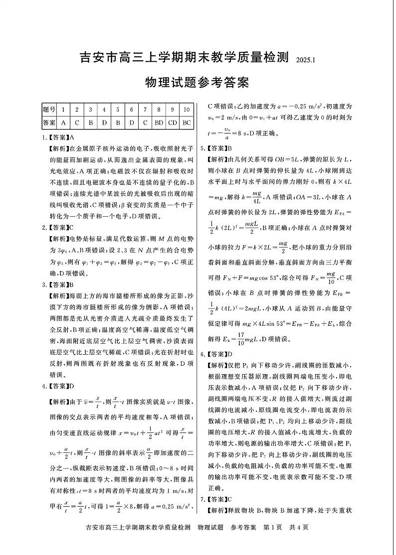 江西省吉安市2025届高三上学期1月期末教学质量检测物理答案