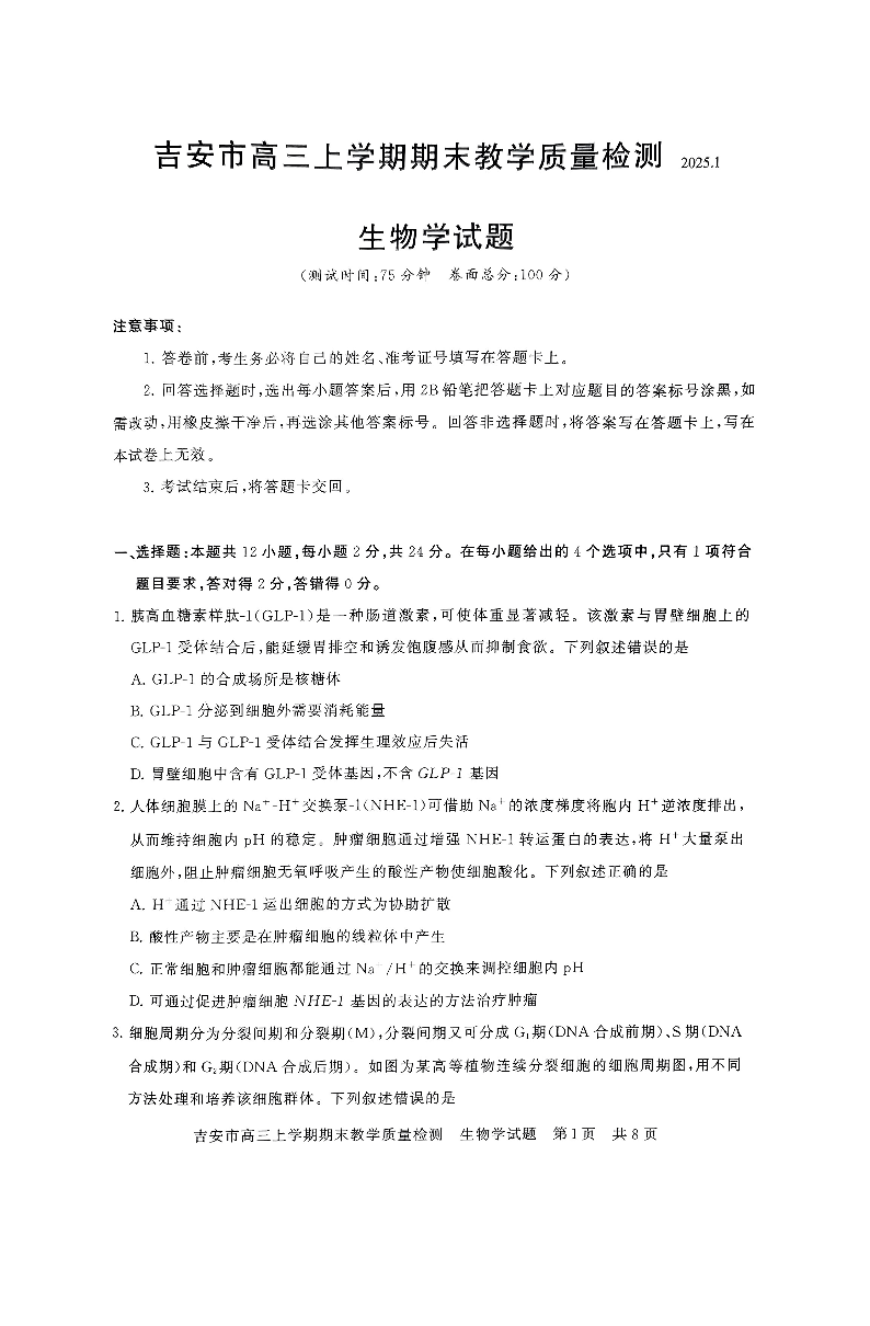 江西省吉安市2025届高三上学期1月期末教学质量检测生物+答案