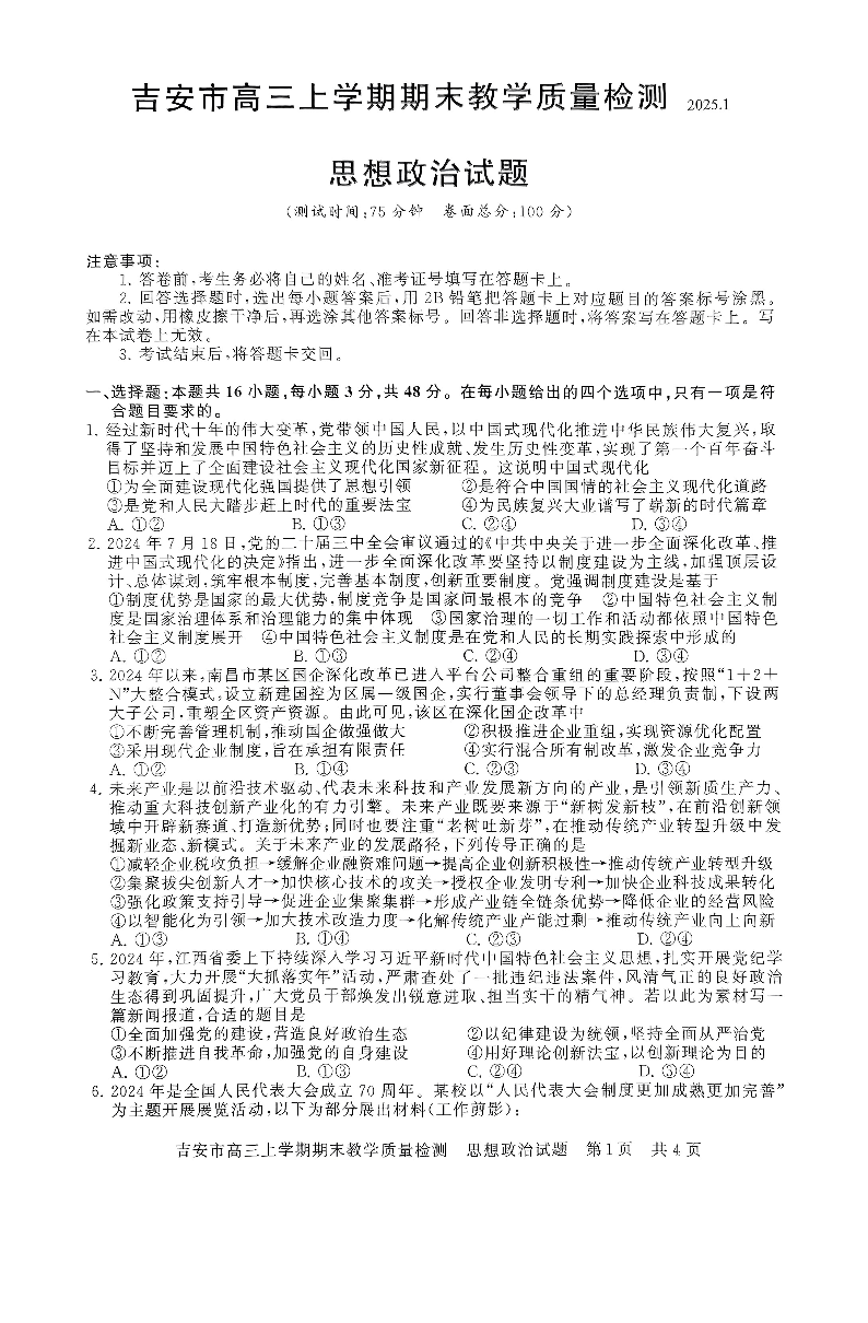 江西省吉安市2025届高三上学期1月期末教学质量检测政治+答案