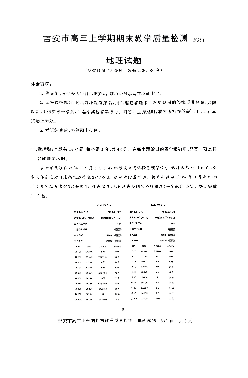 江西省吉安市2025届高三上学期1月期末教学质量检测地理+答案
