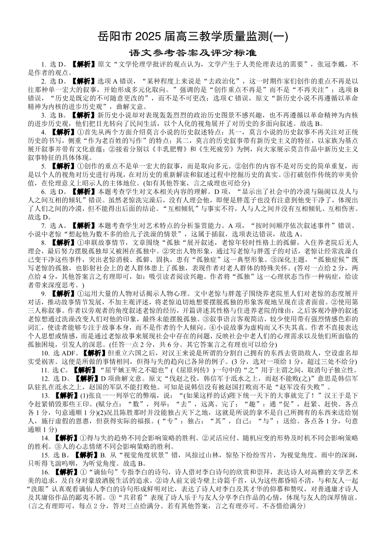 湖南省岳阳市2025届高三上学期教学质量监测(一)语文答案