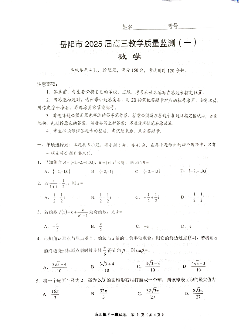 湖南省岳阳市2025届高三上学期教学质量监测(一)数学