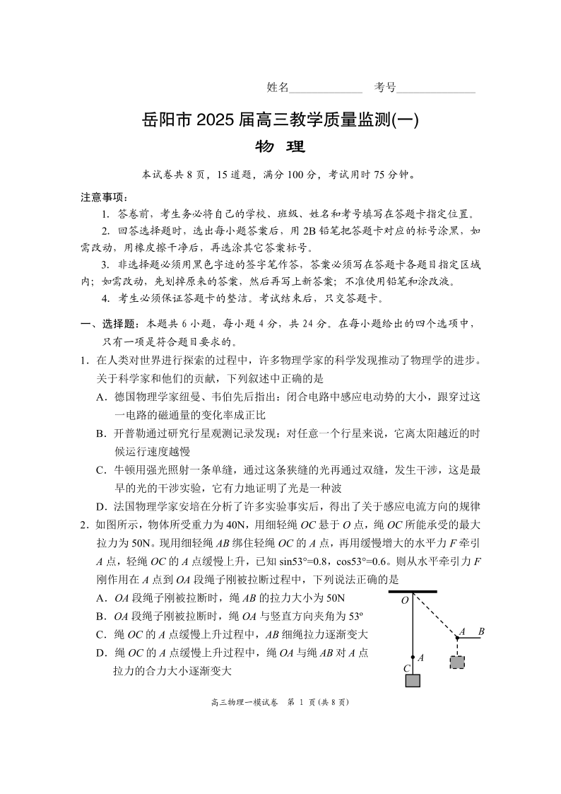 湖南省岳阳市2025届高三上学期教学质量监测(一)物理