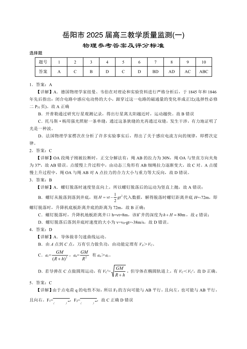 湖南省岳阳市2025届高三上学期教学质量监测(一)物理答案