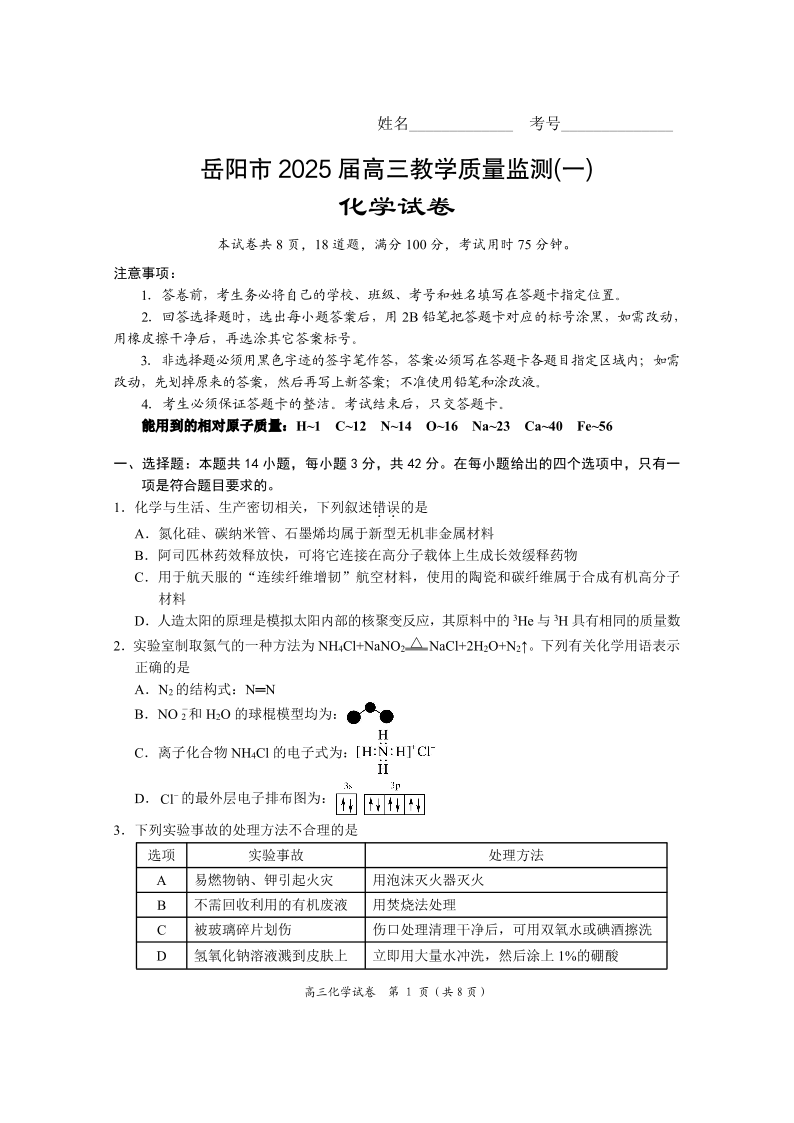 湖南省岳阳市2025届高三上学期教学质量监测(一)化学