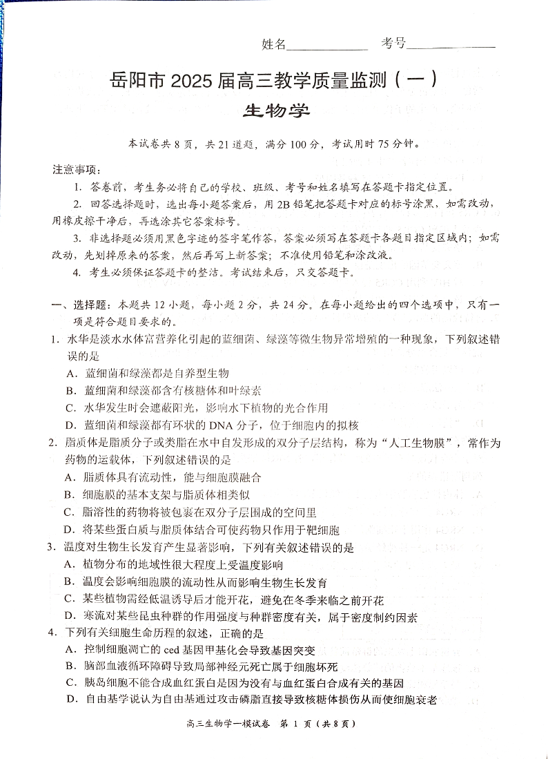 湖南省岳阳市2025届高三上学期教学质量监测(一)生物