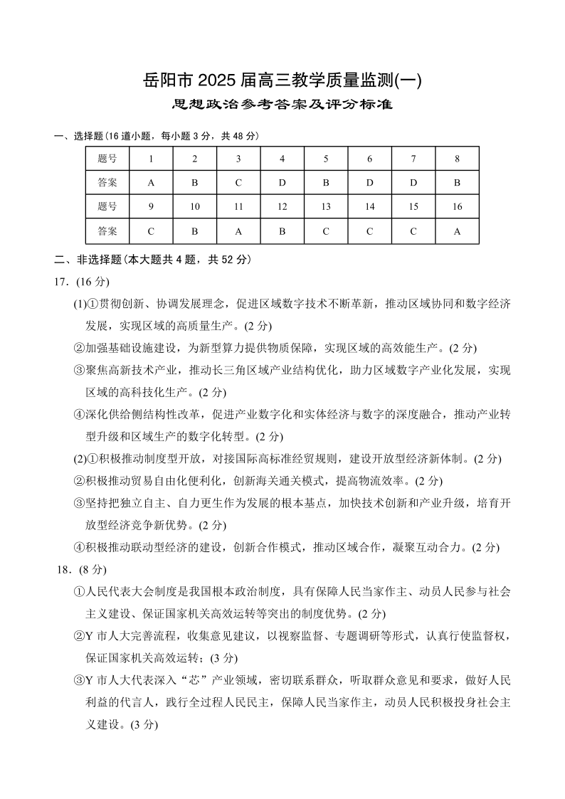 湖南省岳阳市2025届高三上学期教学质量监测(一)政治答案