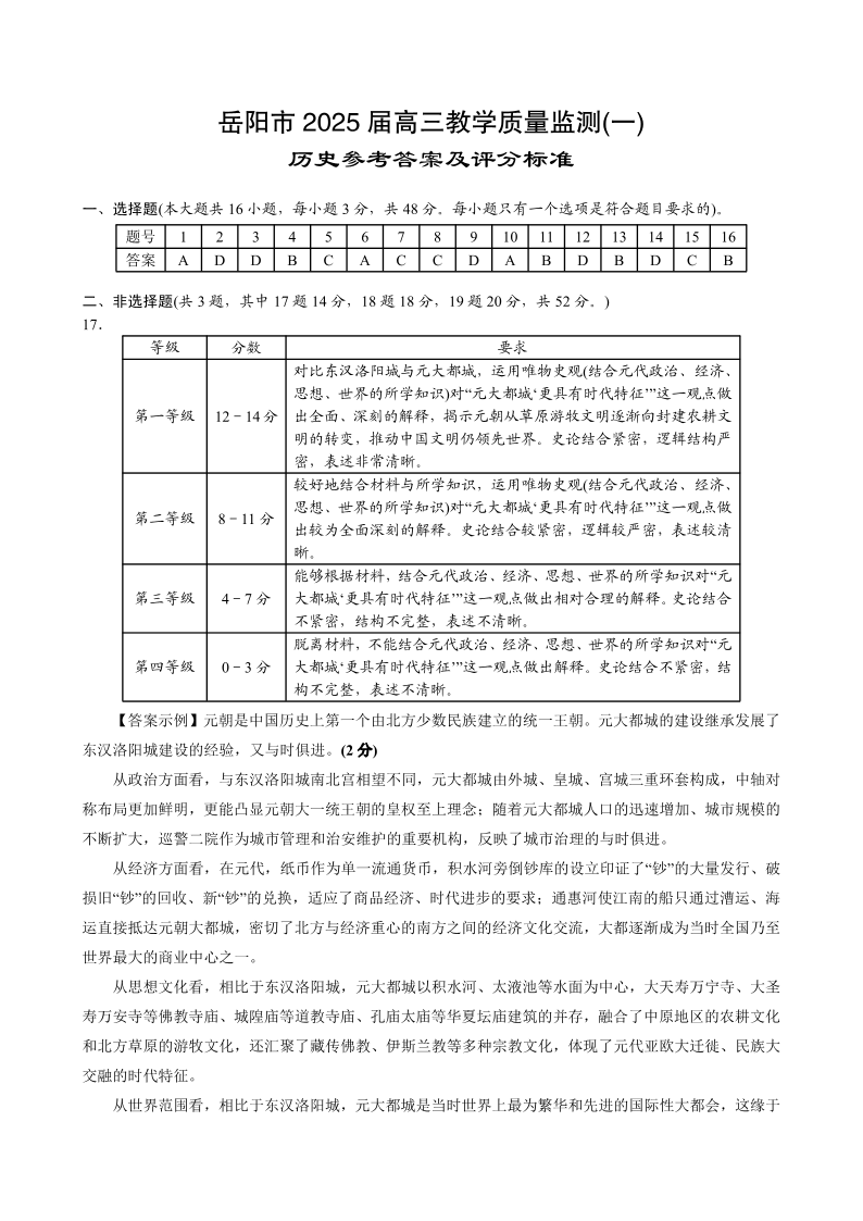 湖南省岳阳市2025届高三上学期教学质量监测(一)历史答案