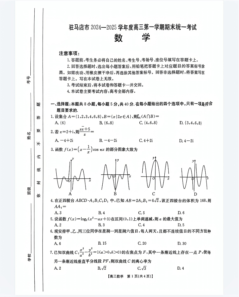 河南省驻马店市2024-2025学年1月高三第一学期期末统一考试数学