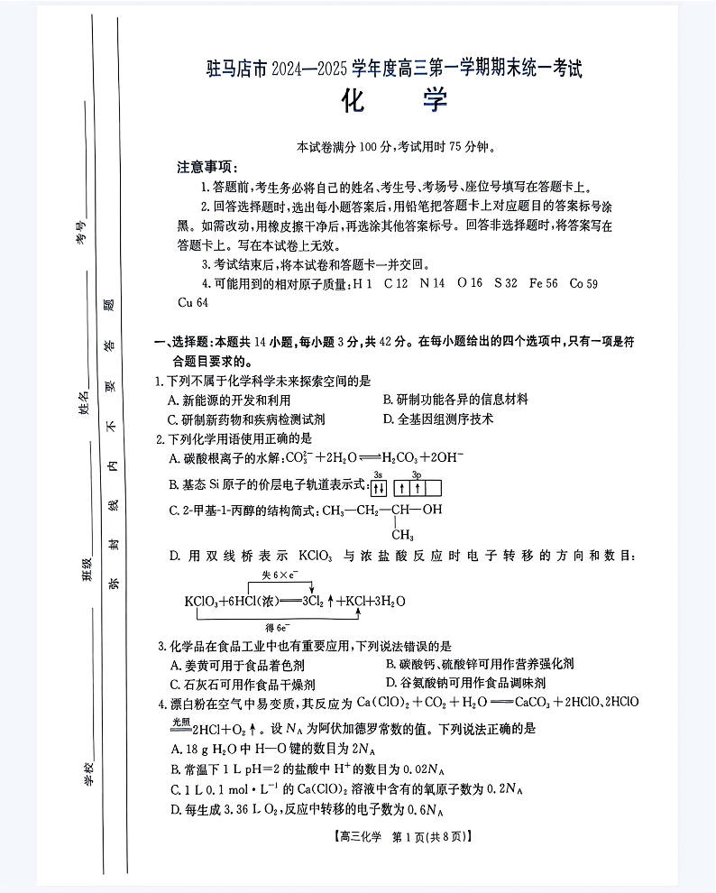 河南省驻马店市2024-2025学年1月高三第一学期期末统一考试化学
