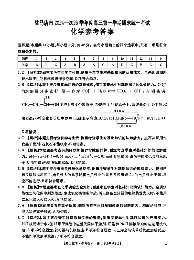 河南省驻马店市2024-2025学年1月高三第一学期期末统一考试化学答案