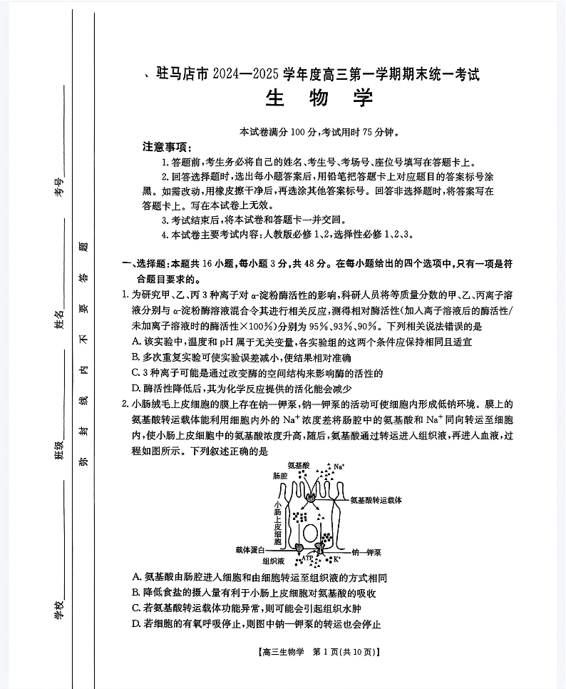 河南省驻马店市2024-2025学年1月高三第一学期期末统一考试生物