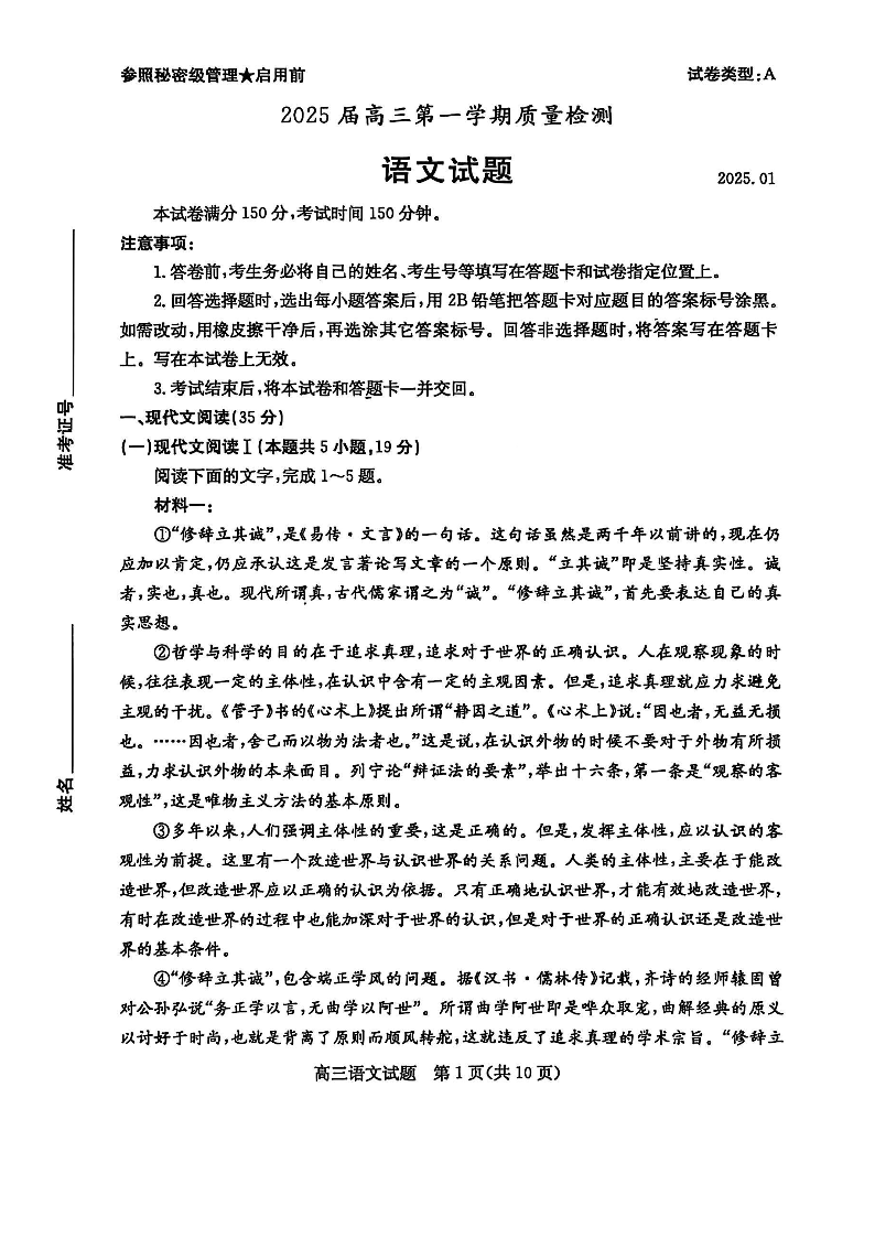 山东省枣庄市2025届高三上学期1月期末质量检测语文