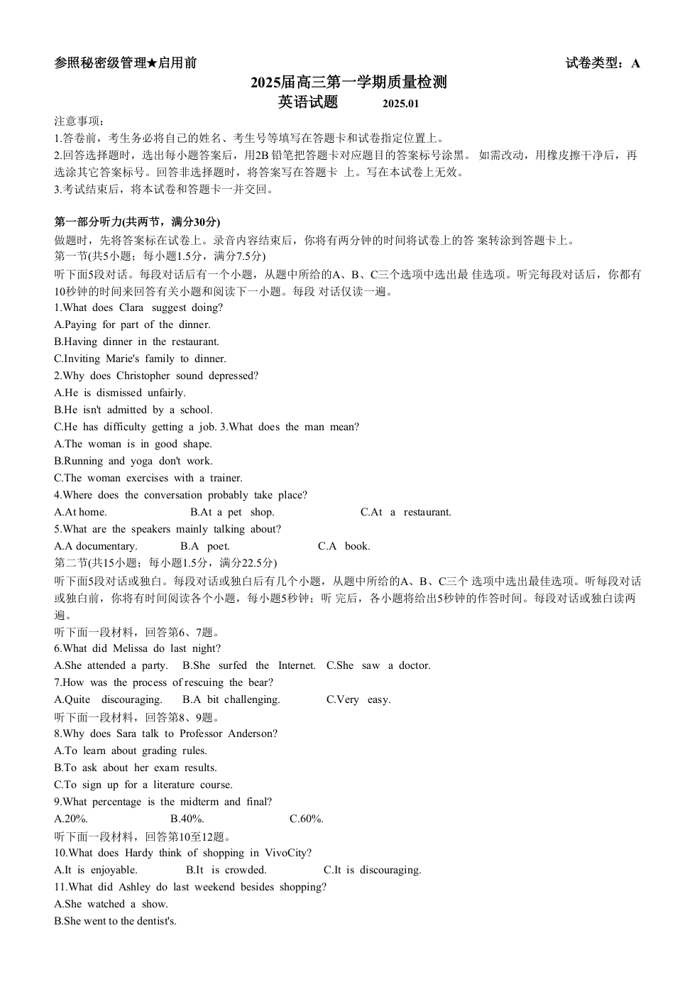 山东省枣庄市2025届高三上学期1月期末质量检测英语