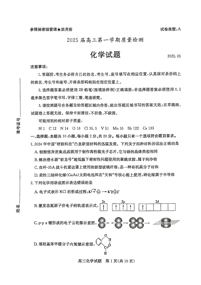 山东省枣庄市2025届高三上学期1月期末质量检测化学