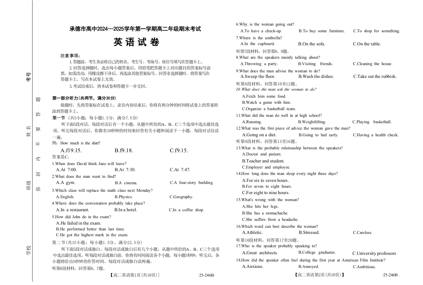 河北省承德市2024-2025学年上学期1月高二期末考试英语
