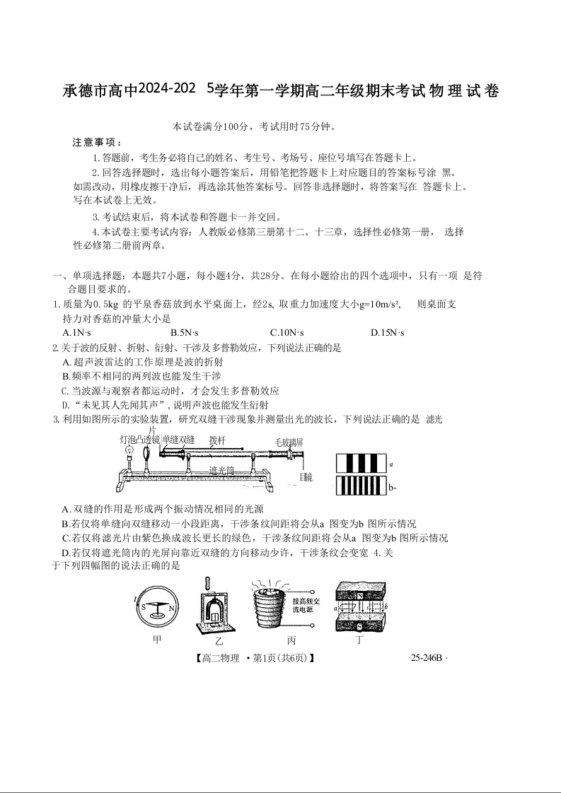 河北省承德市2024-2025学年上学期1月高二期末考试物理