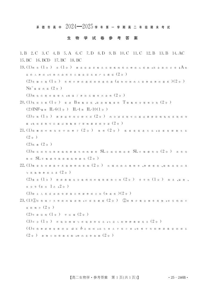 河北省承德市2024-2025学年上学期1月高二期末考试生物答案